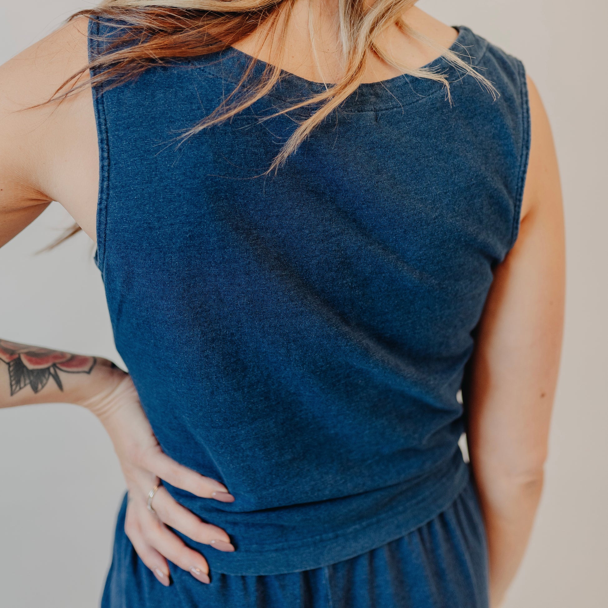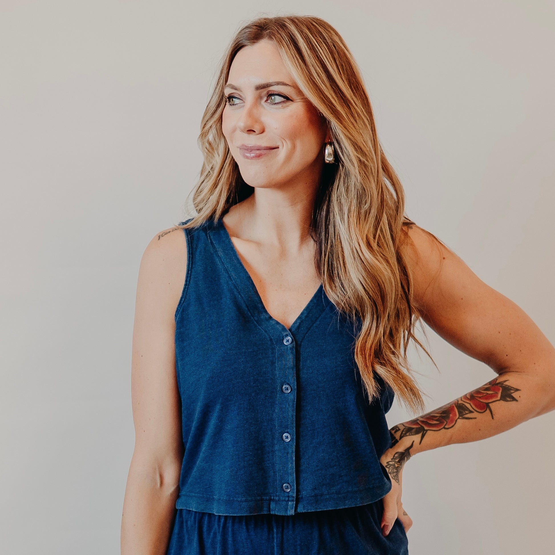 A laid-back essential with a touch of polish. This sleeveless knit top features a button-front design and a cropped length that makes it perfect for pairing with high-rise bottoms. The denim-blue shade adds a casual, everyday vibe you’ll reach for again and again.