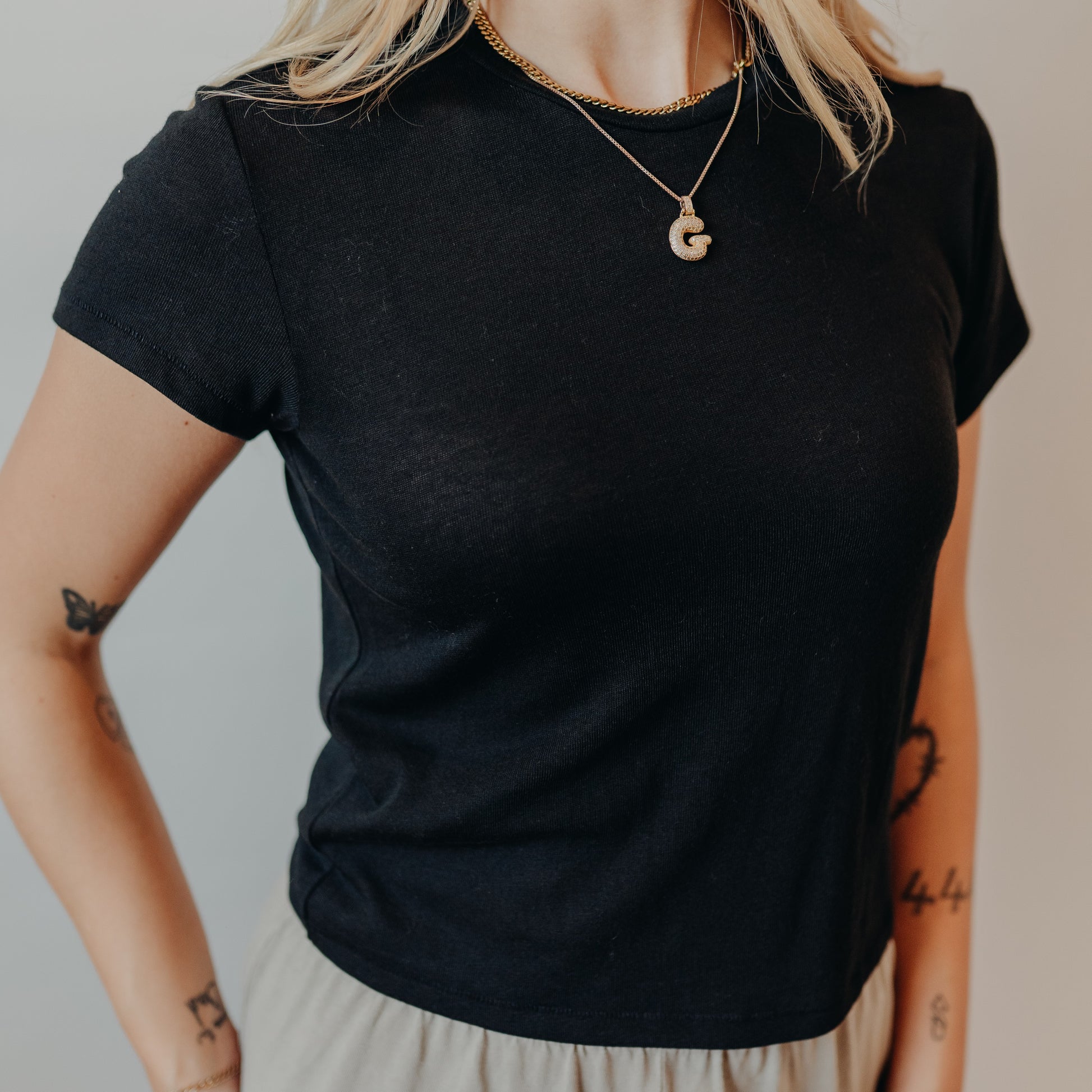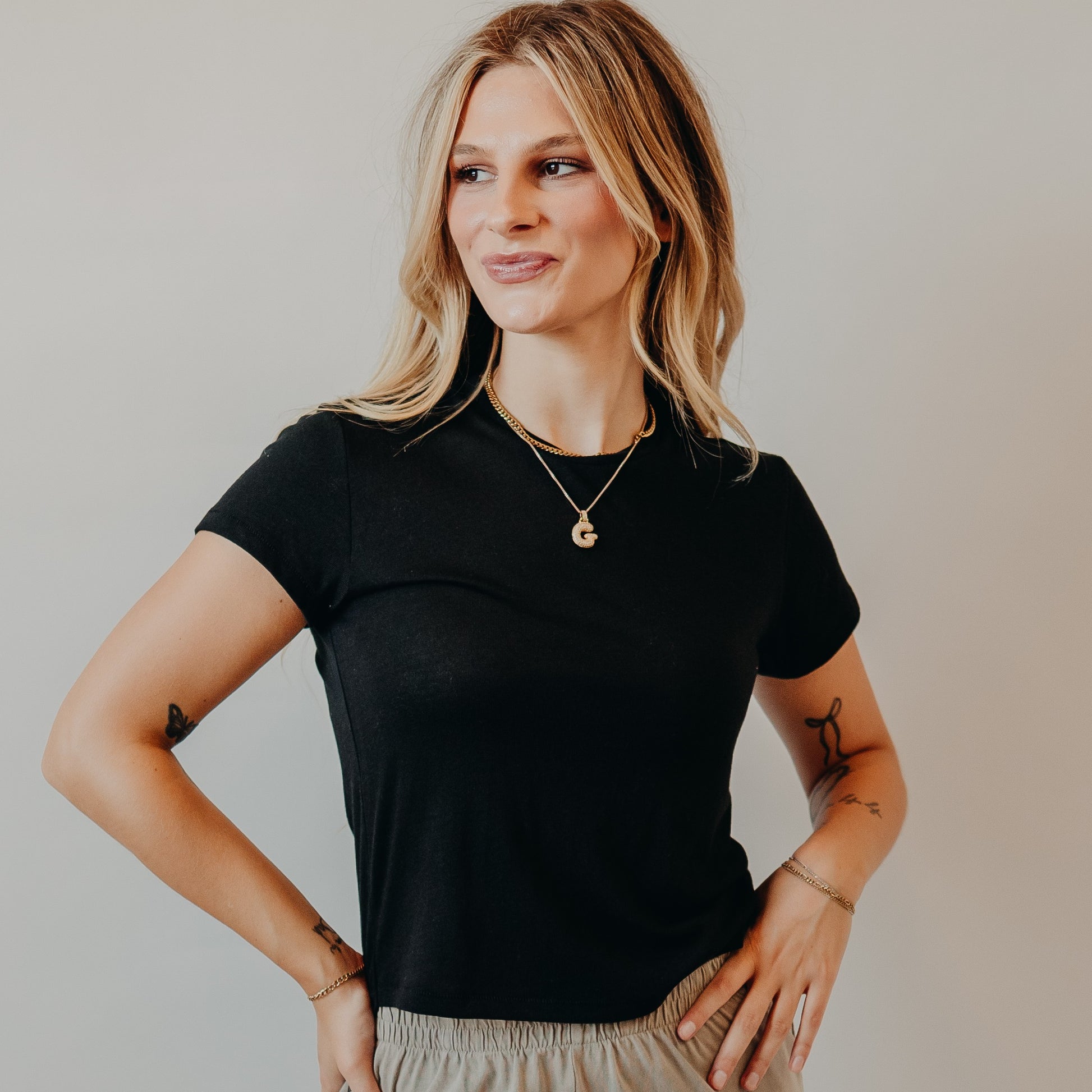 This tee proves basics don’t have to be boring. Crafted in a soft black hue, it’s the perfect layering piece for any season. The simple crew neckline and short sleeves make it an easy grab for pairing with denim, skirts, or layering under cardigans. Lightweight with just enough stretch, it’s a wardrobe essential you’ll reach for again and again.